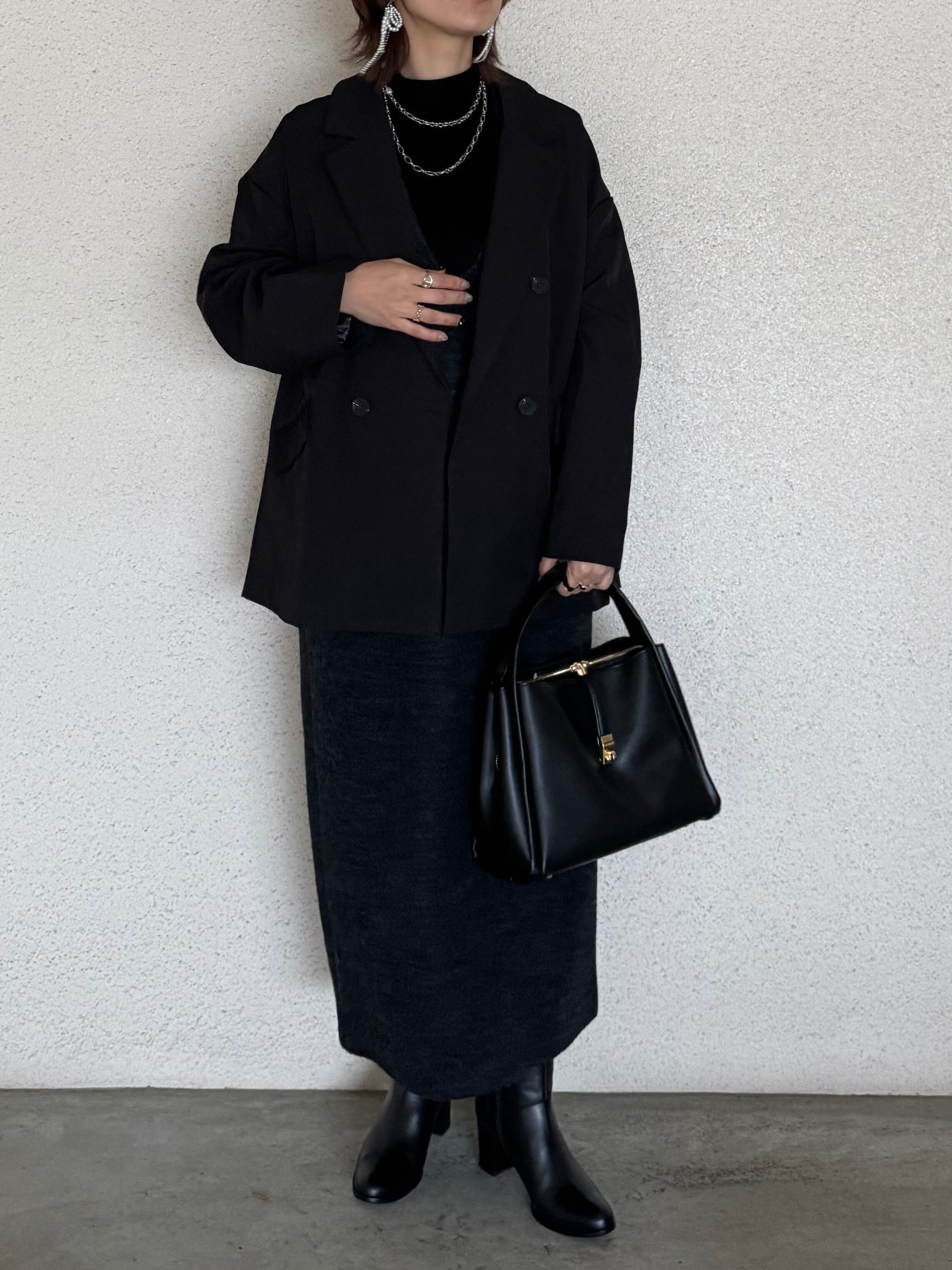 裏地もかっこよく!裏地ストライプ テーラードジャケット×ジャンスカ2点Set ブラック