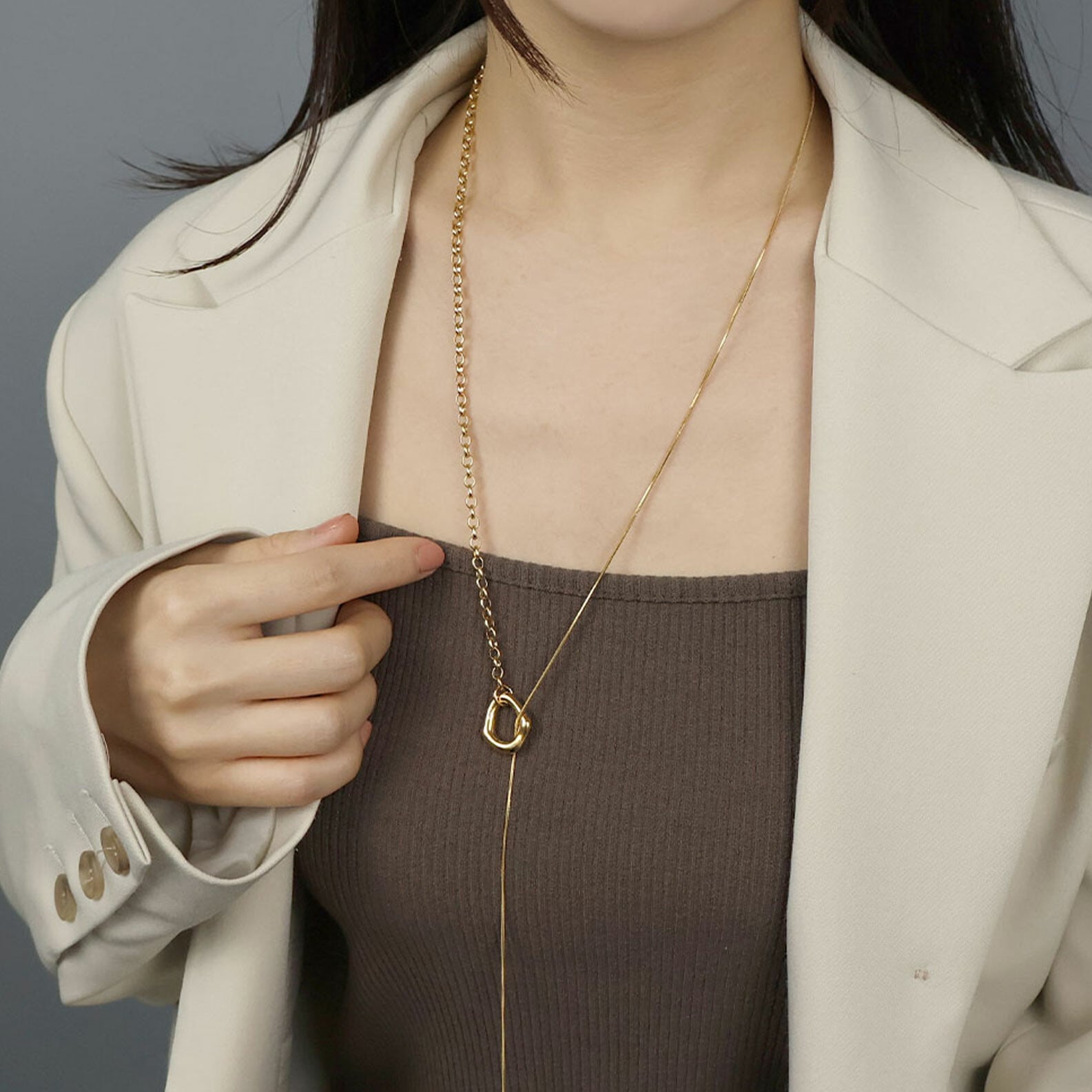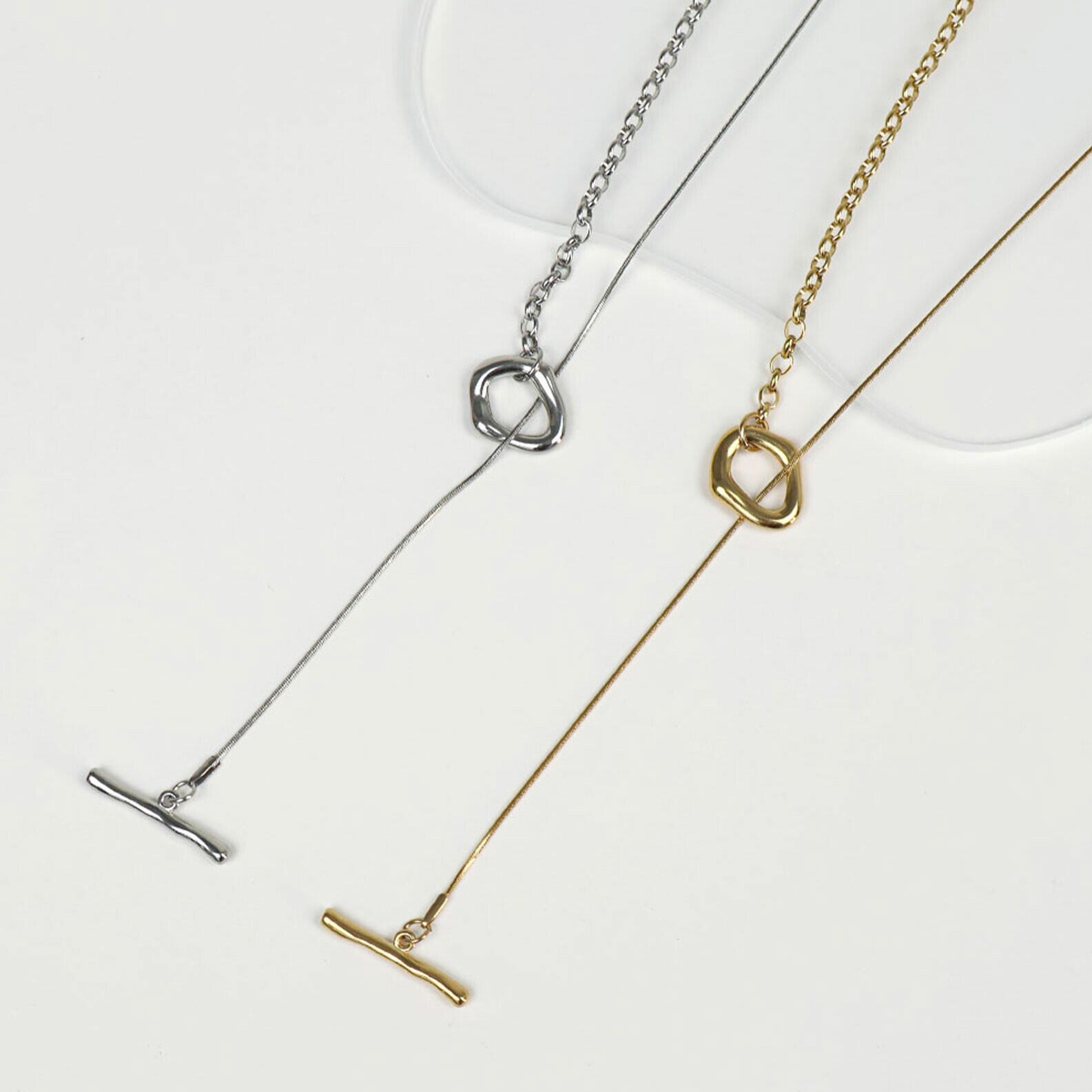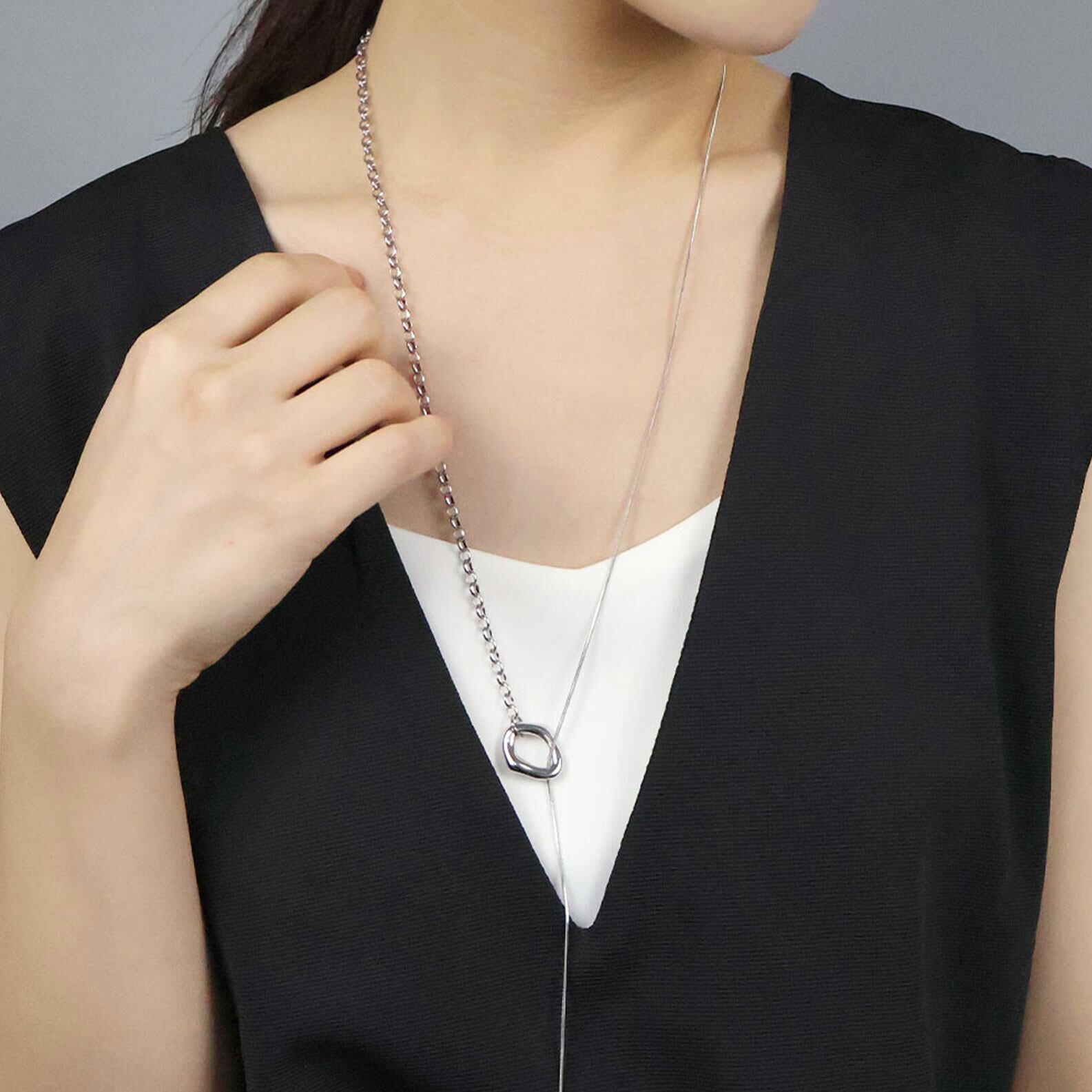 【金属アレルギー対応 3way コンビチェーン マンテル Yシェイプネックレス / サージカルステンレス 】スネークチェーンとオーバルチェーンを組み合わせたロングネックレス。マンテルパーツはニュアンス感たっぷりなデザインにし、よりトレンディに仕上げました。ロングネックレスとしてや、Yシェイプネックレス・2連ネックレスにもなる3way仕様が魅力のアイテムです。