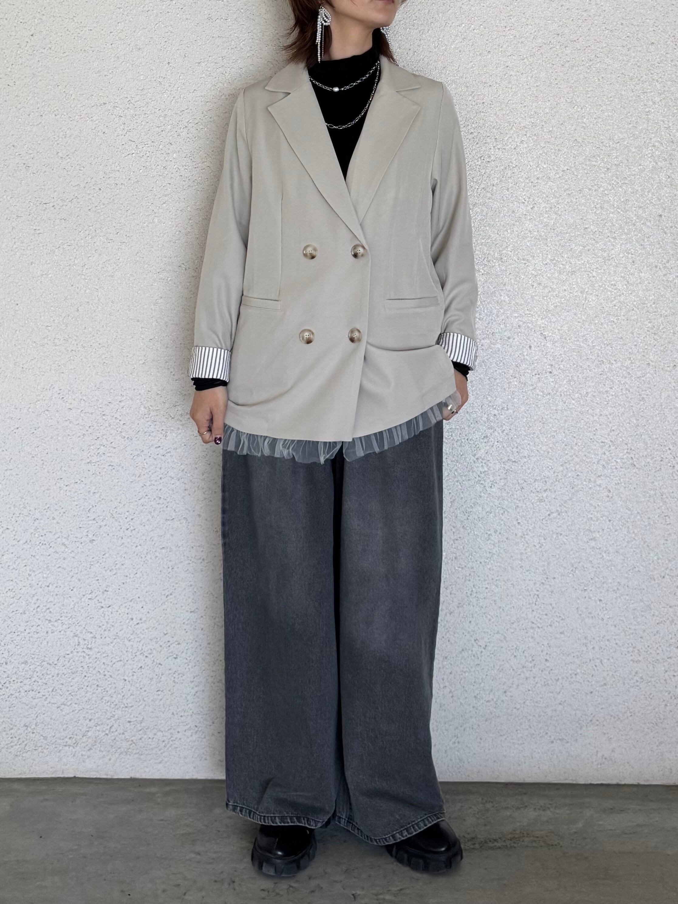 メンズライクなテーラードジャケットに、Babらしいフリルをあしらったデザイン。裾のフリルは取り外し可能で、クールにセットアップとしてもお使いいただけます。2パターンで着回しがきくので、合わせるアイテムによって使い分けていただける万能なデザインです。