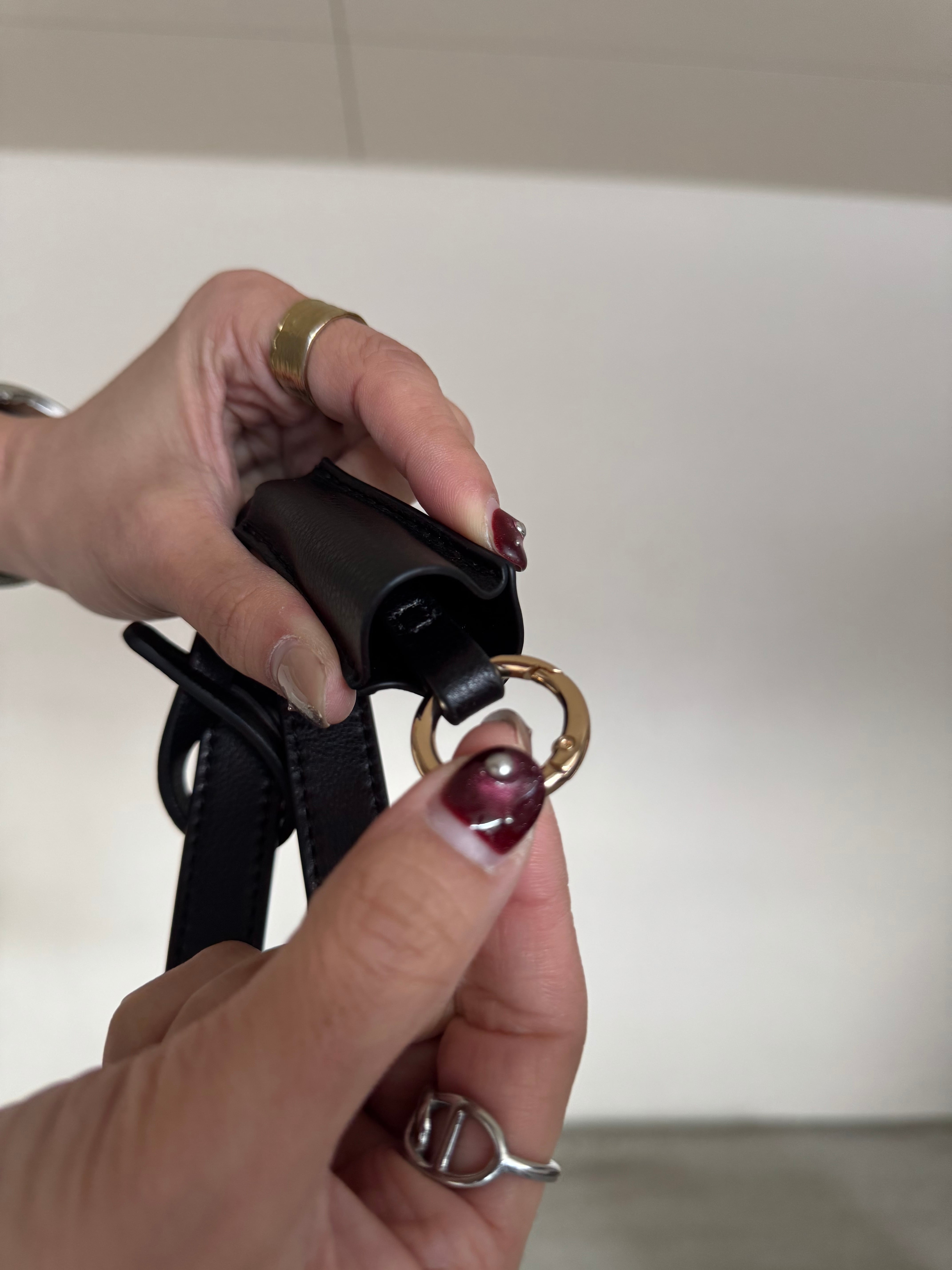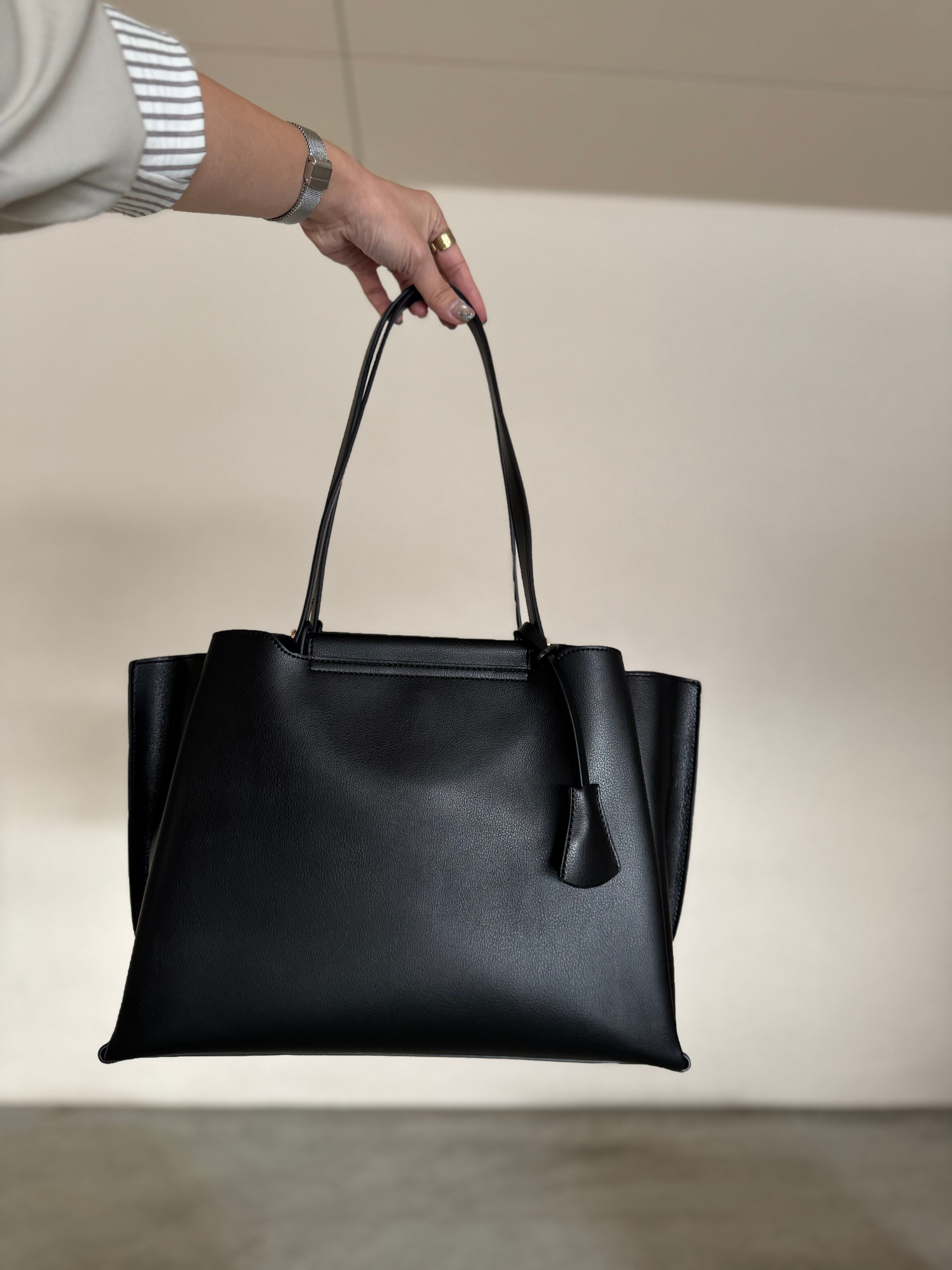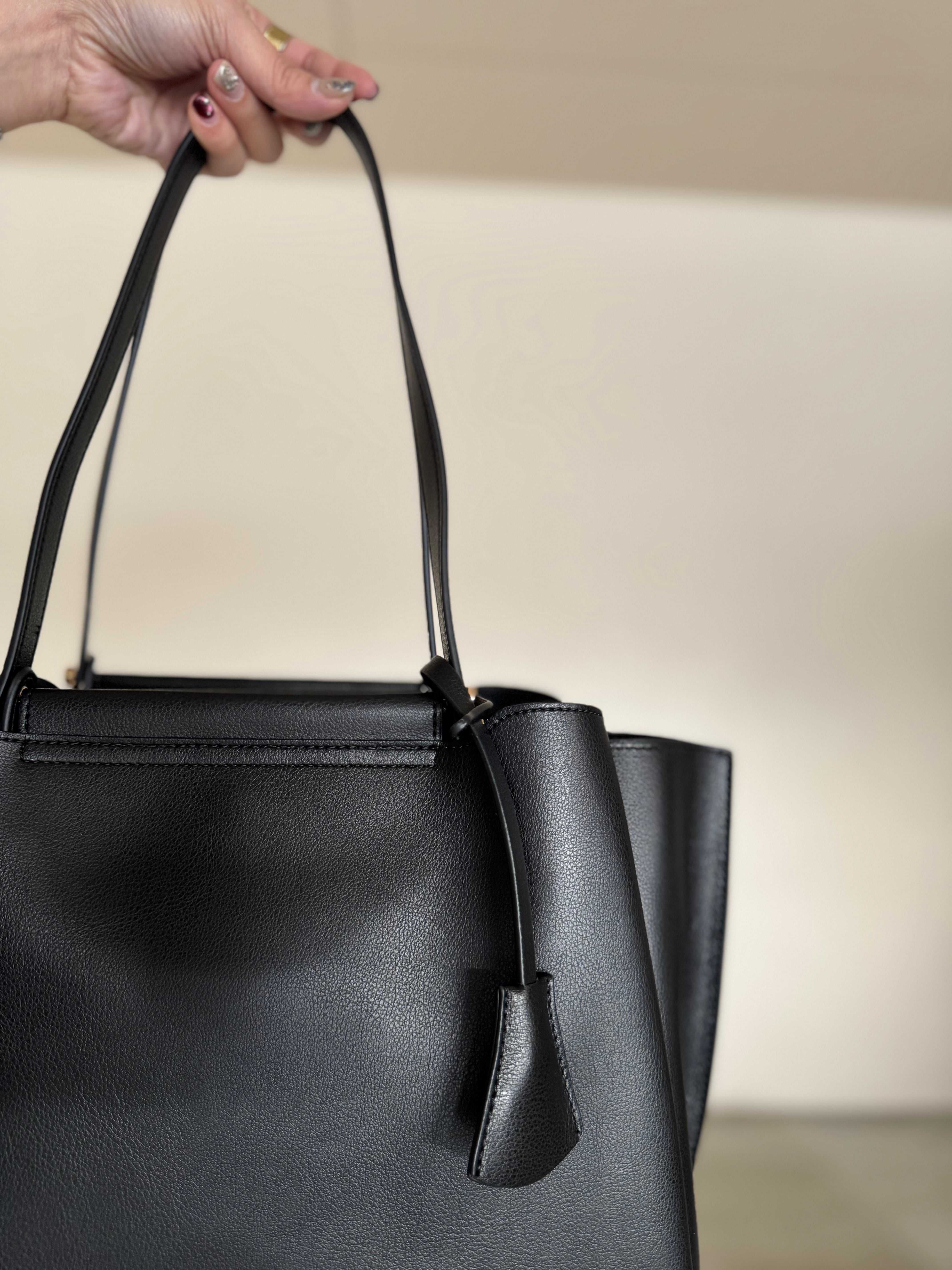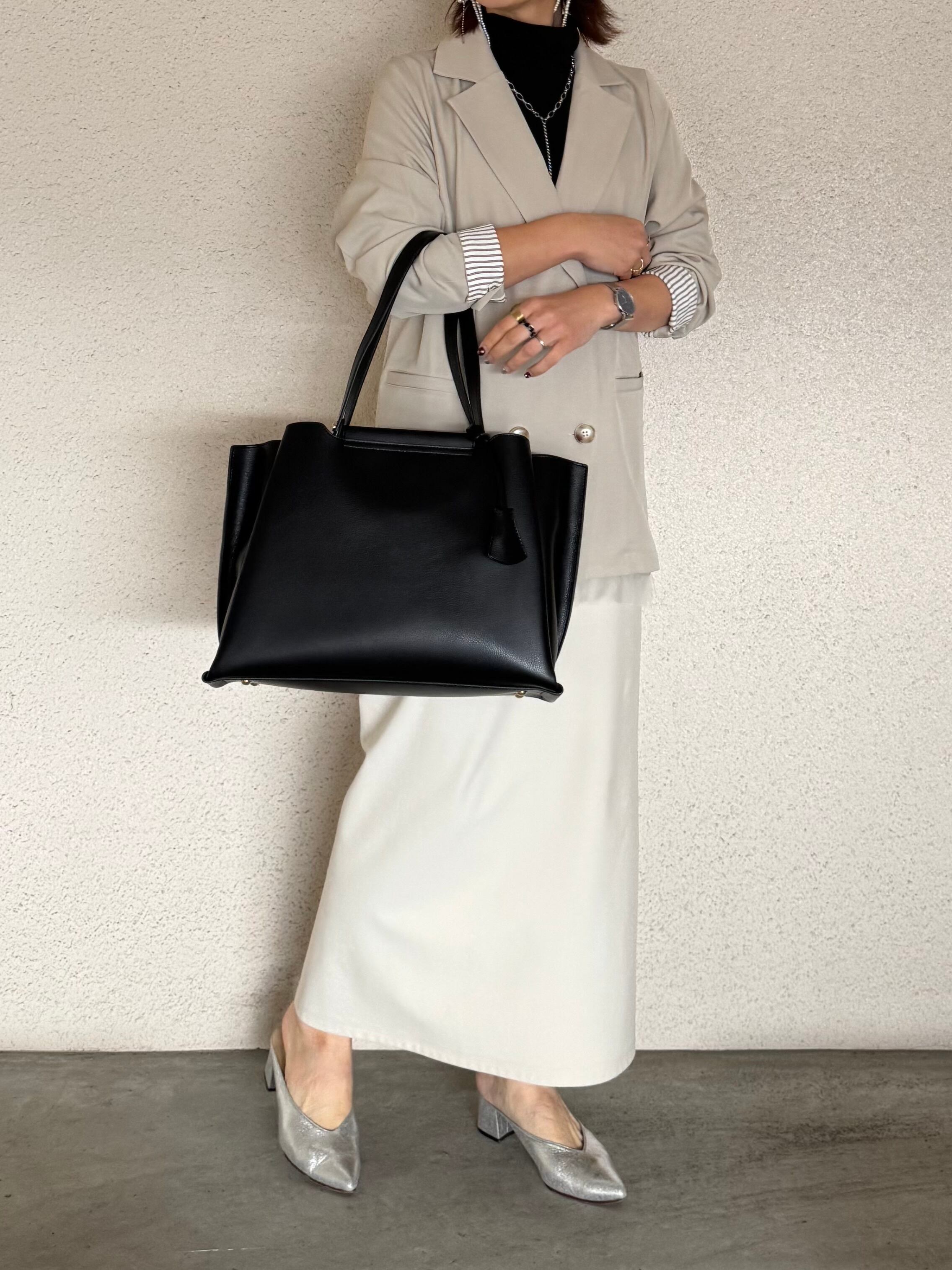 荷物の整理がしやすい3部屋構造・長さの違うダブルハンドルで肩掛け可能・鍵などを付けられるキーチャーム付き・ショルダーストラップが無いので手持ちの際にすっきりとした印象に。