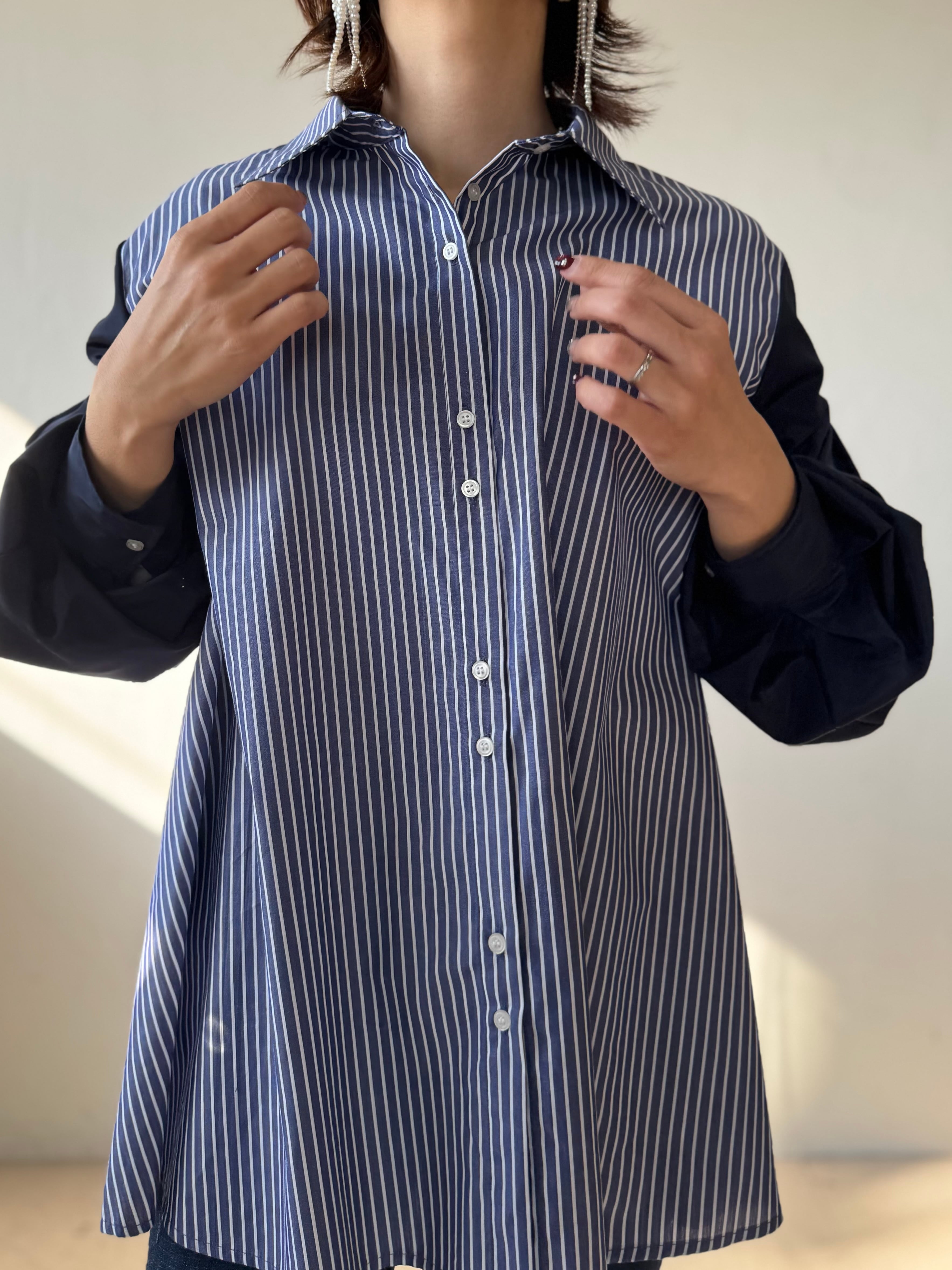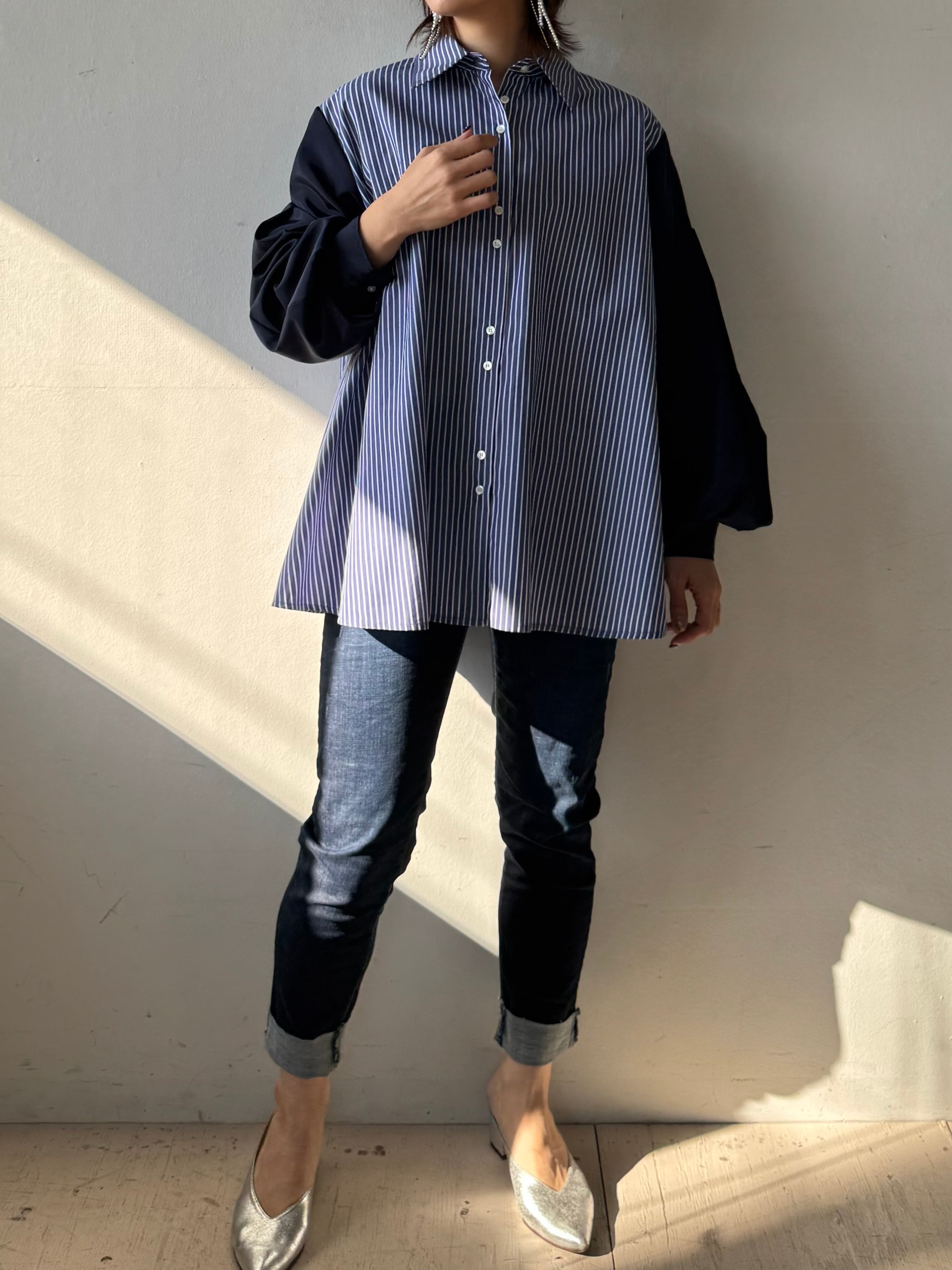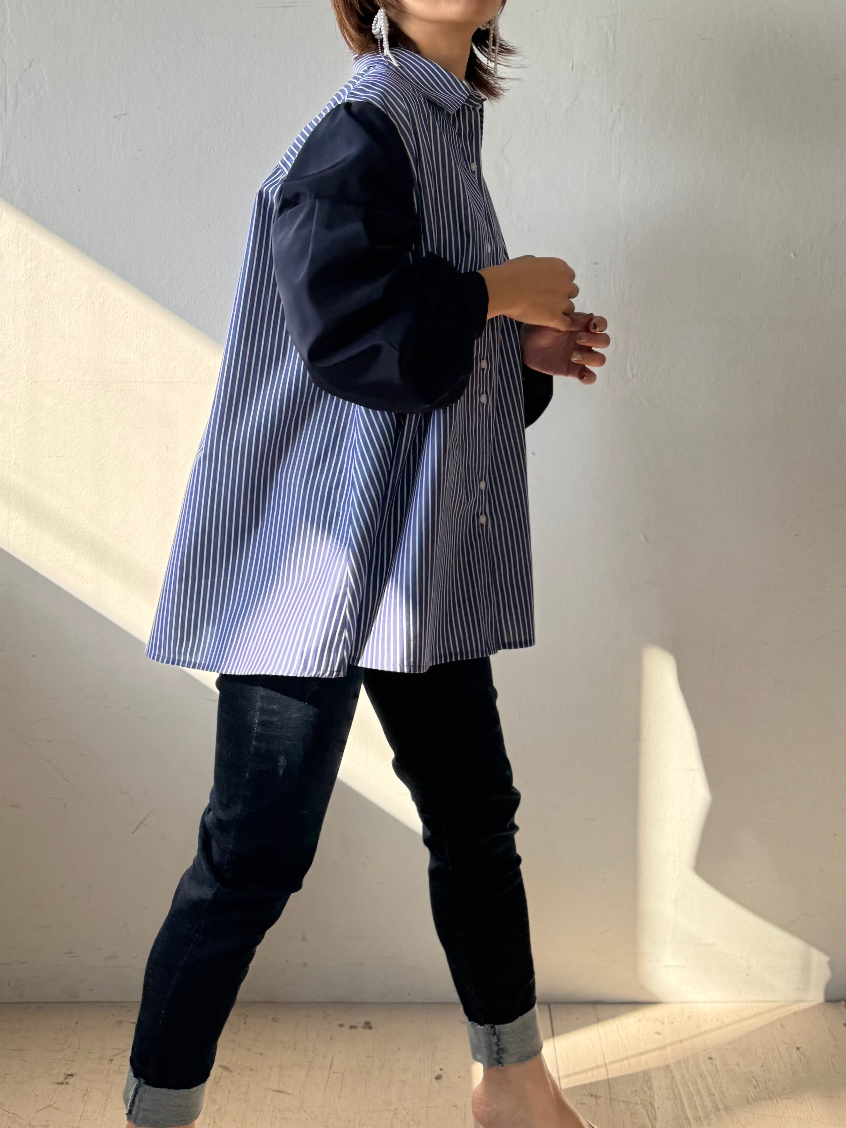 ストライプ×無地の切替デザインが映えるルーズシャツ